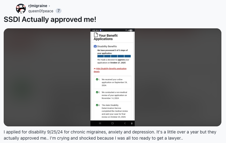 A user on r/migraine posted that they were recently approved for SSDI for chronic migraine. Here are the key details directly from their account: